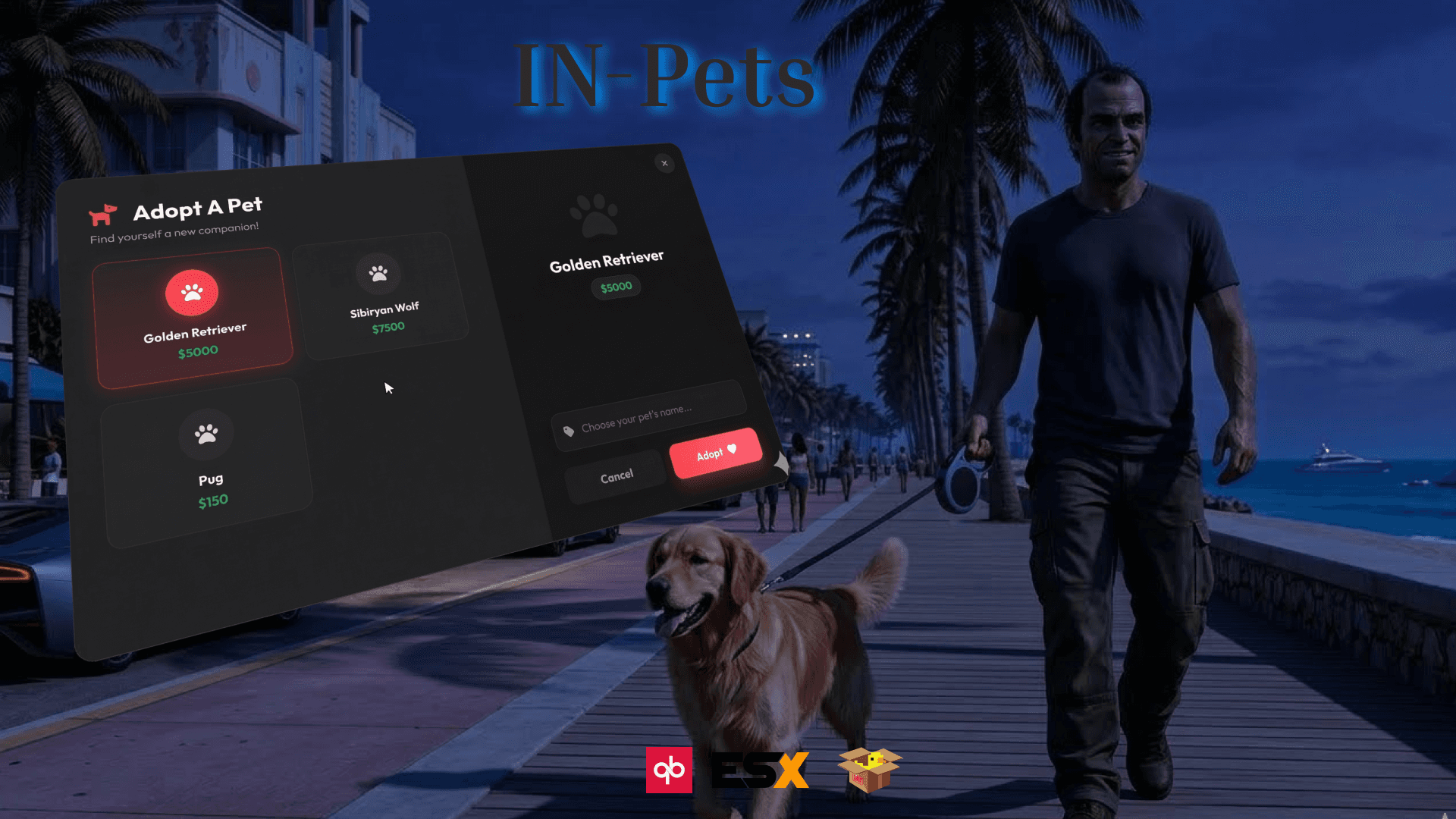 Enhance your FiveM server with the **IN-Pets Advanced Pets System**! 🚀 Fully configurable and optimized, this script lets players adopt, manage, and interact with custom pets. With a modern UI, diverse pet types, and support for multiple frameworks, your server will shine! 🎉